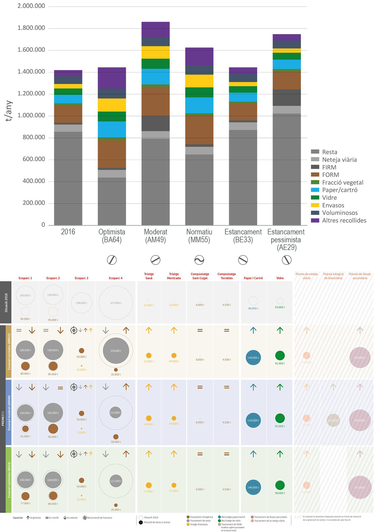 Cal millorar la quantitat i la qualitat de residus recollits selectivament i, de retruc, reconvertir aquelles plantes de tractament de resta que ja no siguin necessàries per convertir-les en plantes de tractament de fracció orgànica i separació de materials reciclables. Com a resultat d’això, es reduirà la necessitat de destinacions finalistes i es podrà reduir gradualment l’abocament controlat i la incineració amb recuperació d’energia. - Cal anar més enllà del tractament, des de la innovació i el lideratge